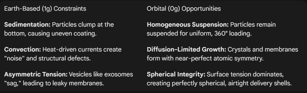In 0g, the exosome remains a perfect sphere, allowing researchers to overcome the Deformation Gap (which causes cargo loss) and Donor-Cell Mimicry (which triggers the immune system).