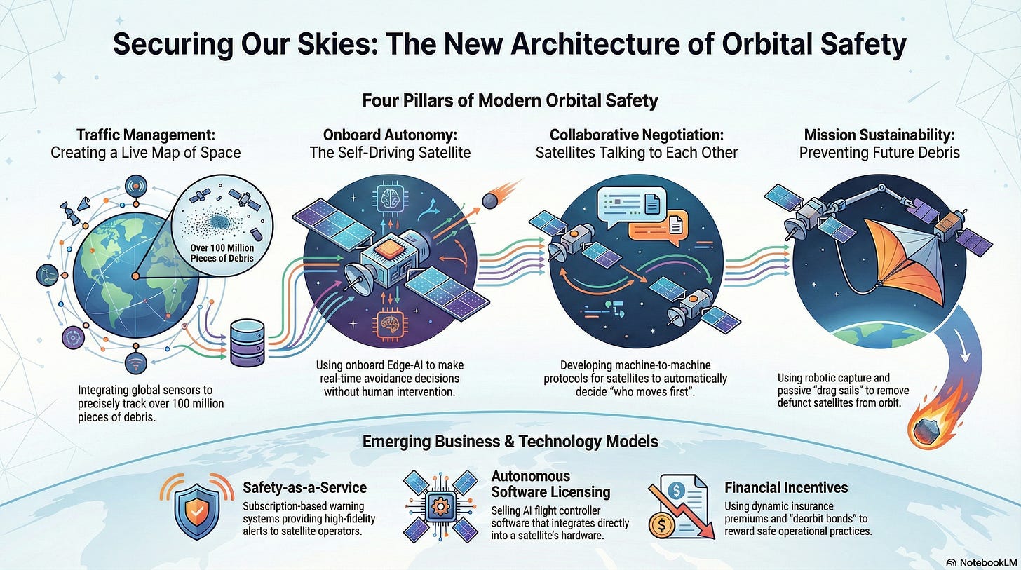 Model: A company operates a proprietary sensor network and provides a subscription-based “Warning System.” Satellite operators pay to receive high-fidelity, processed alerts that are more accurate than public military data.