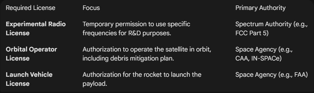 Relevant Licenses: Experimental Radio License, Orbital Operator License (for debris mitigation plan), Launch Vehicle License.