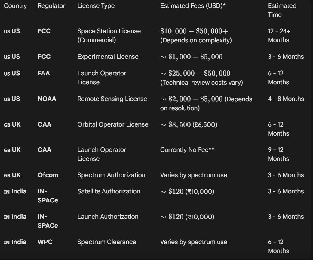 This table compares the estimated costs and timelines for securing the necessary licenses to operate and launch a satellite in major jurisdictions based on typical commercial applications.