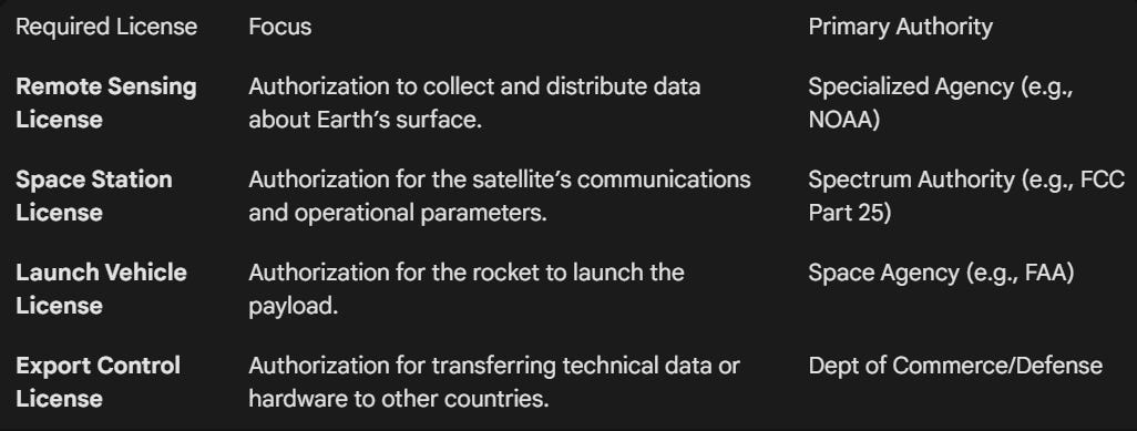 Relevant Licenses: Remote Sensing, Space Station (if satellite has downlink capabilities), Launch Vehicle, Export Control (e.g. ITAR/ ETAR).