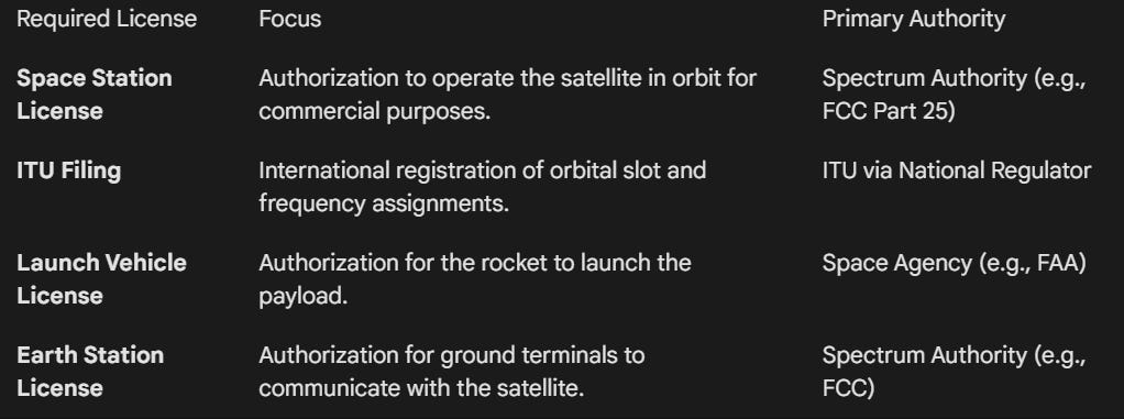Relevant Licenses: Space Station (for orbital operation), Spectrum Allocation (ITU), Launch Vehicle, Earth Station (for ground terminals)
