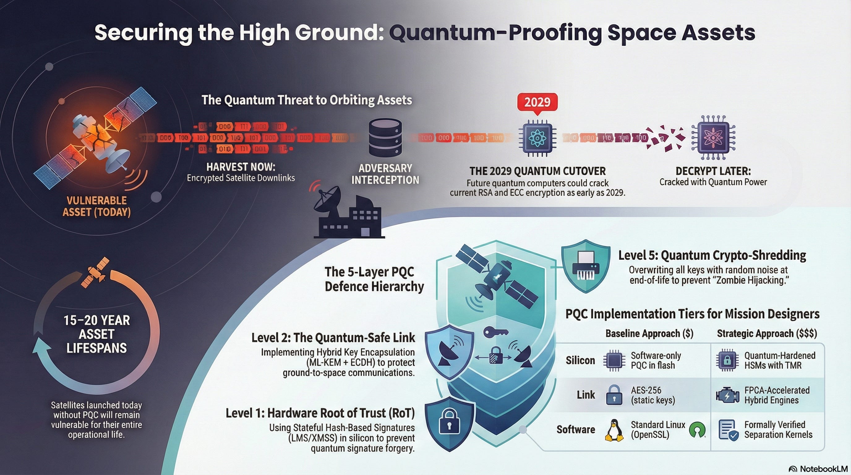 Adversaries may intercept satellite downlinks today, banking on the fact that future quantum computers will crack current RSA and ECC encryption as early as 2029.