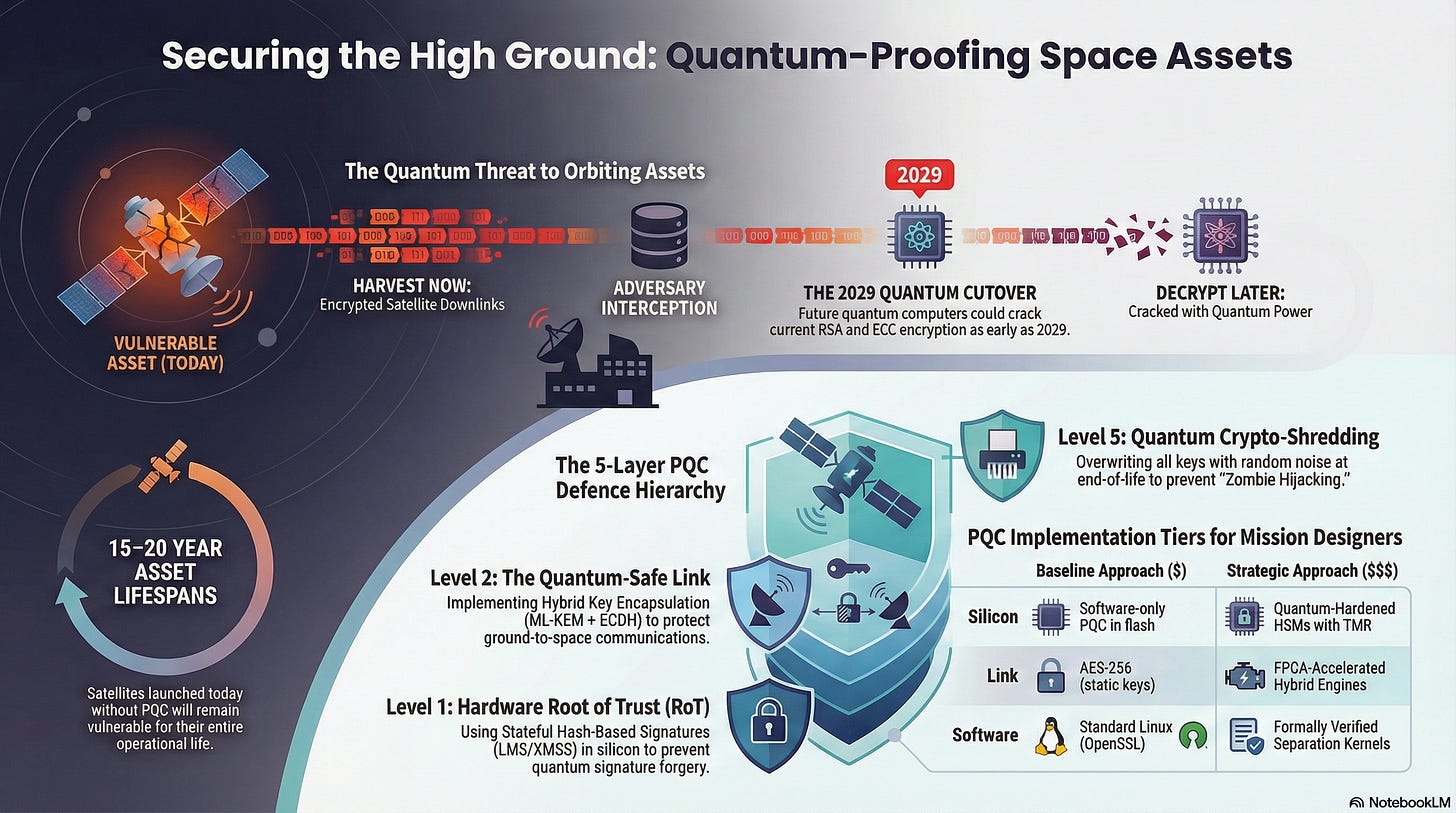 The Compromise: The link between the satellite and the ground remains “Quantum-Vulnerable.” The operator must accept that an adversary could record this traffic today and crack it in 2030.